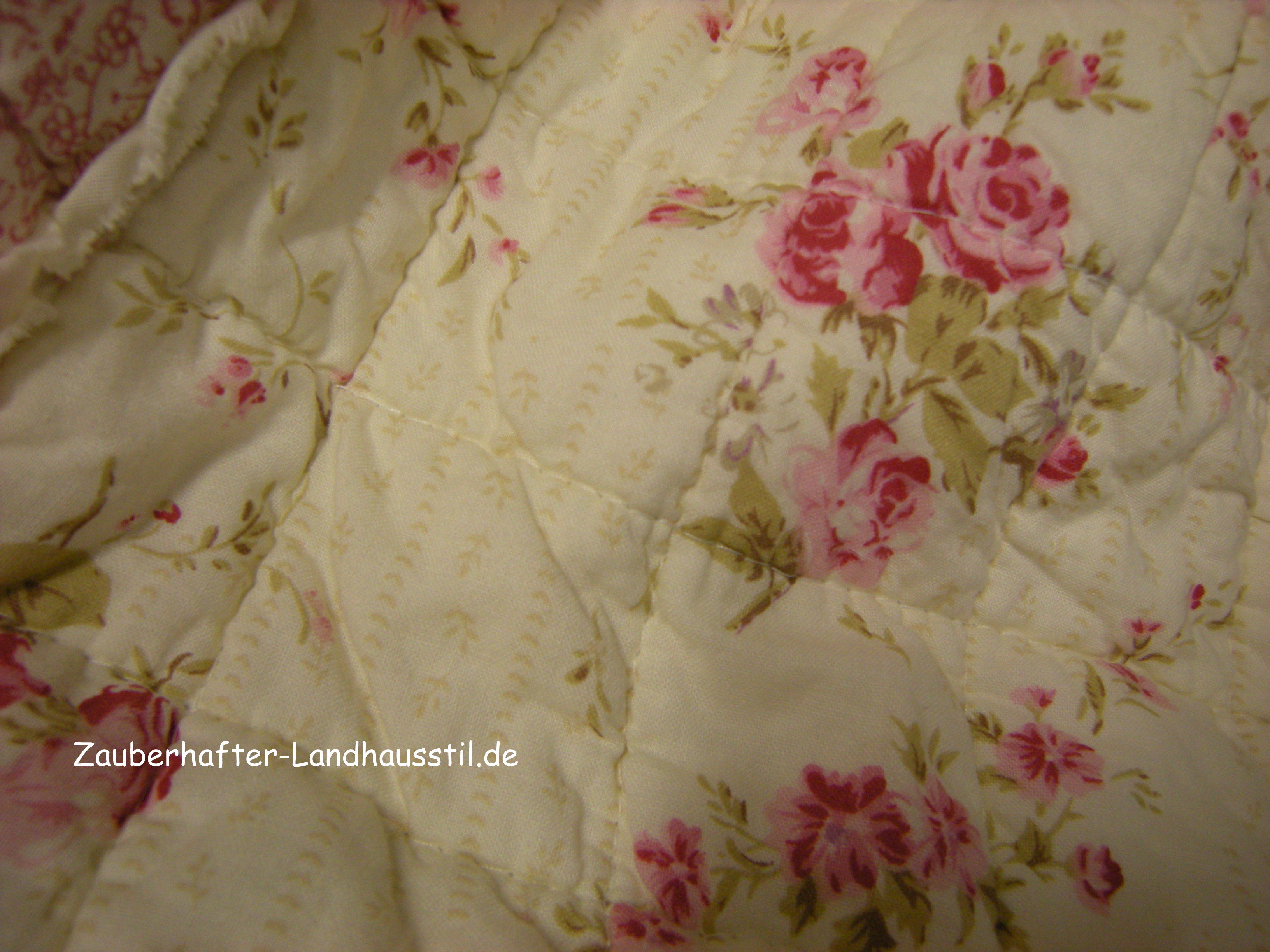 in einer traumhaften Farbkomposition über und über mit Rosen und Streuröschen übersät, creme über rosa zu weiß. Die einzelnen Stofffelder sowie der Rand sind mit einer Stoffbordüre eingefasst.Die Rückseite ist creme mit bordeauxfarbenen Streublümchen. Eine Decke für Romantiker.Ob als Sofaüberwurf oder als TagesdeckeRomantik Pur.....