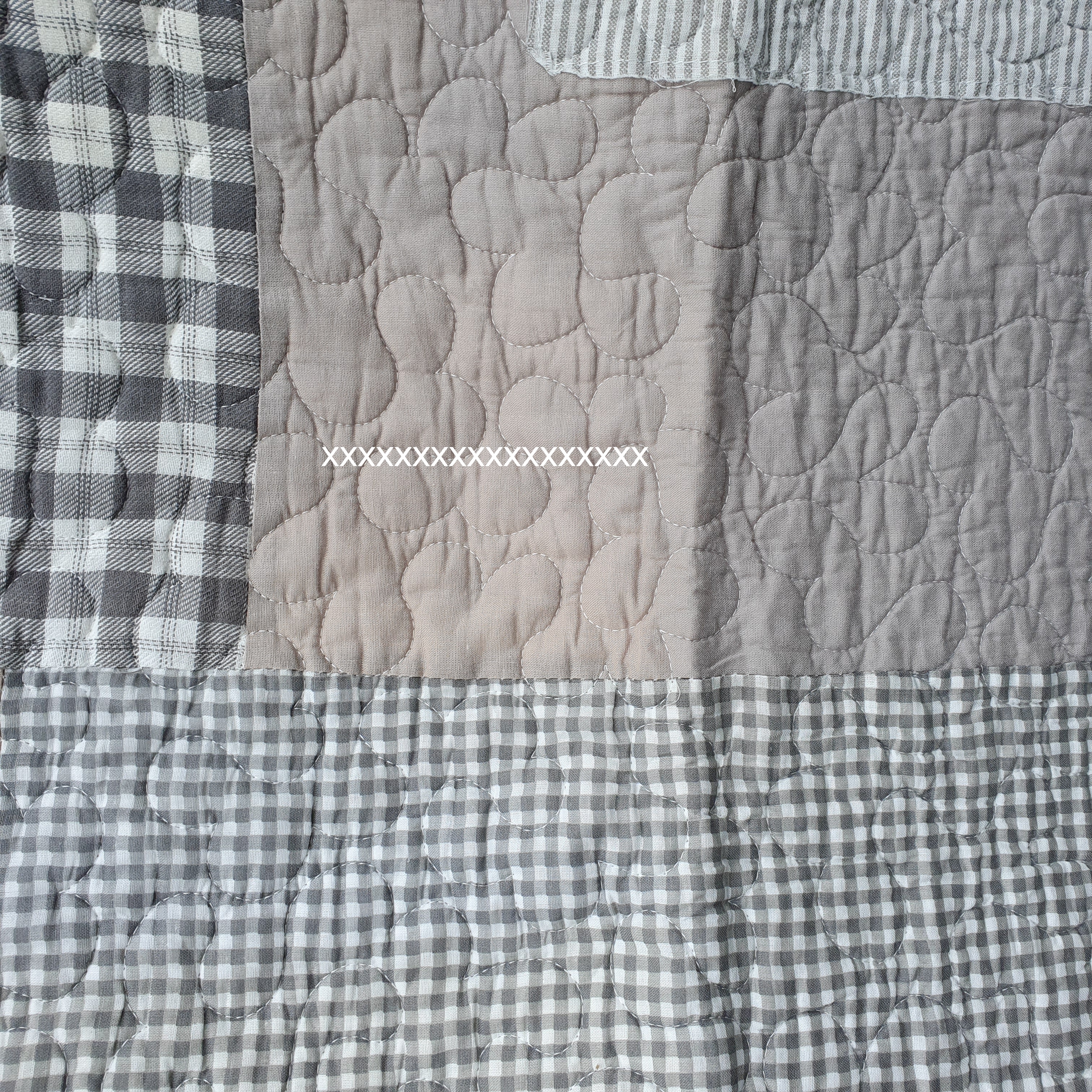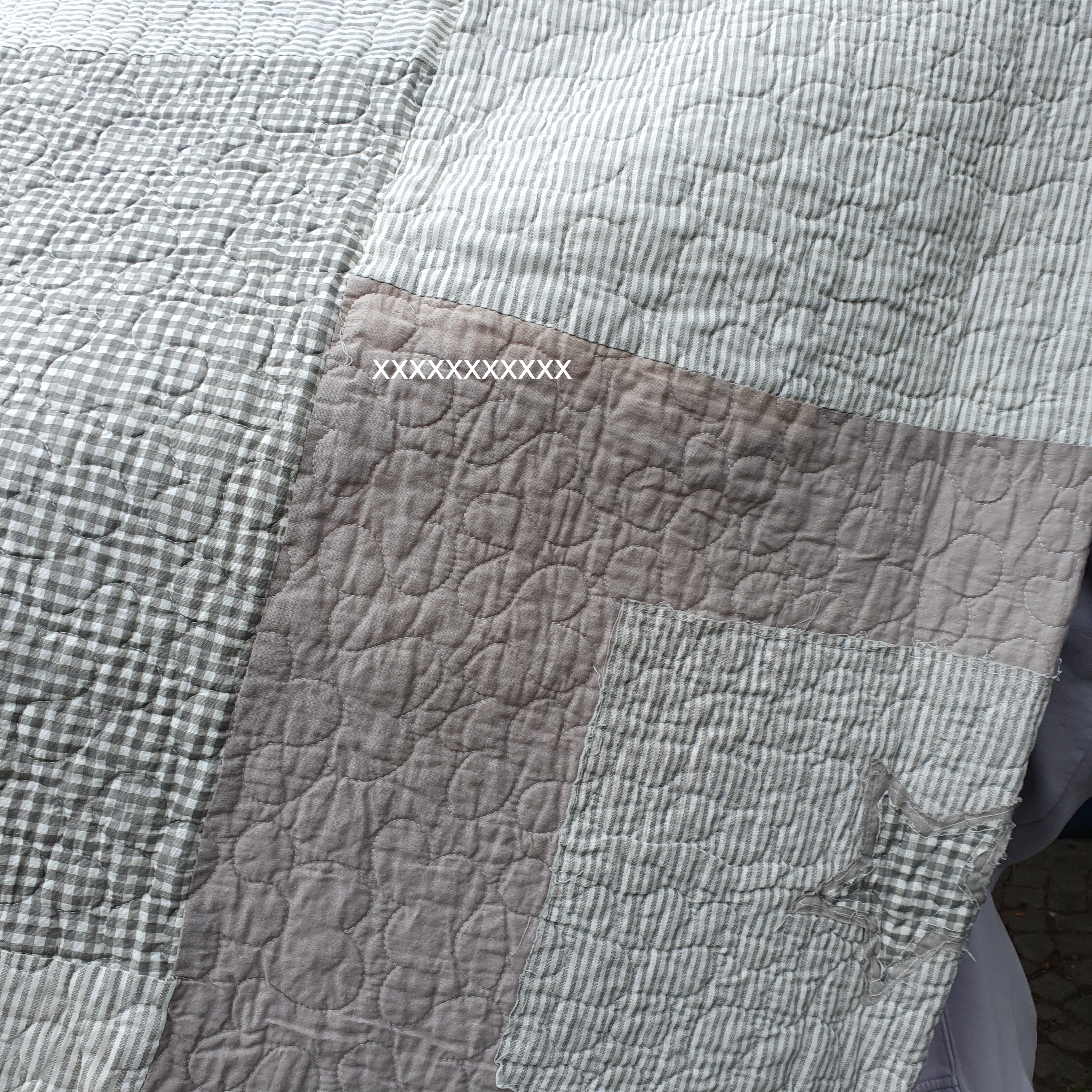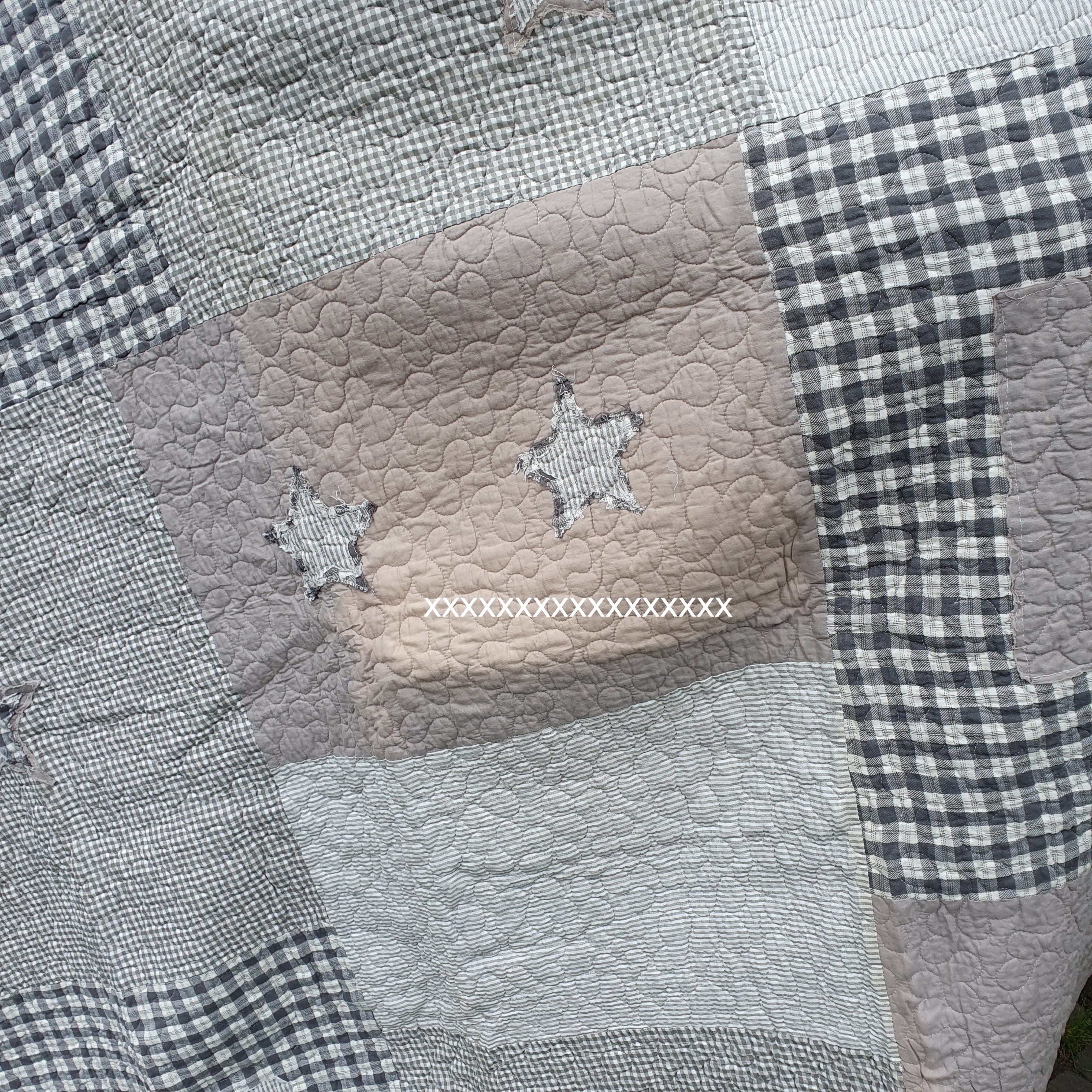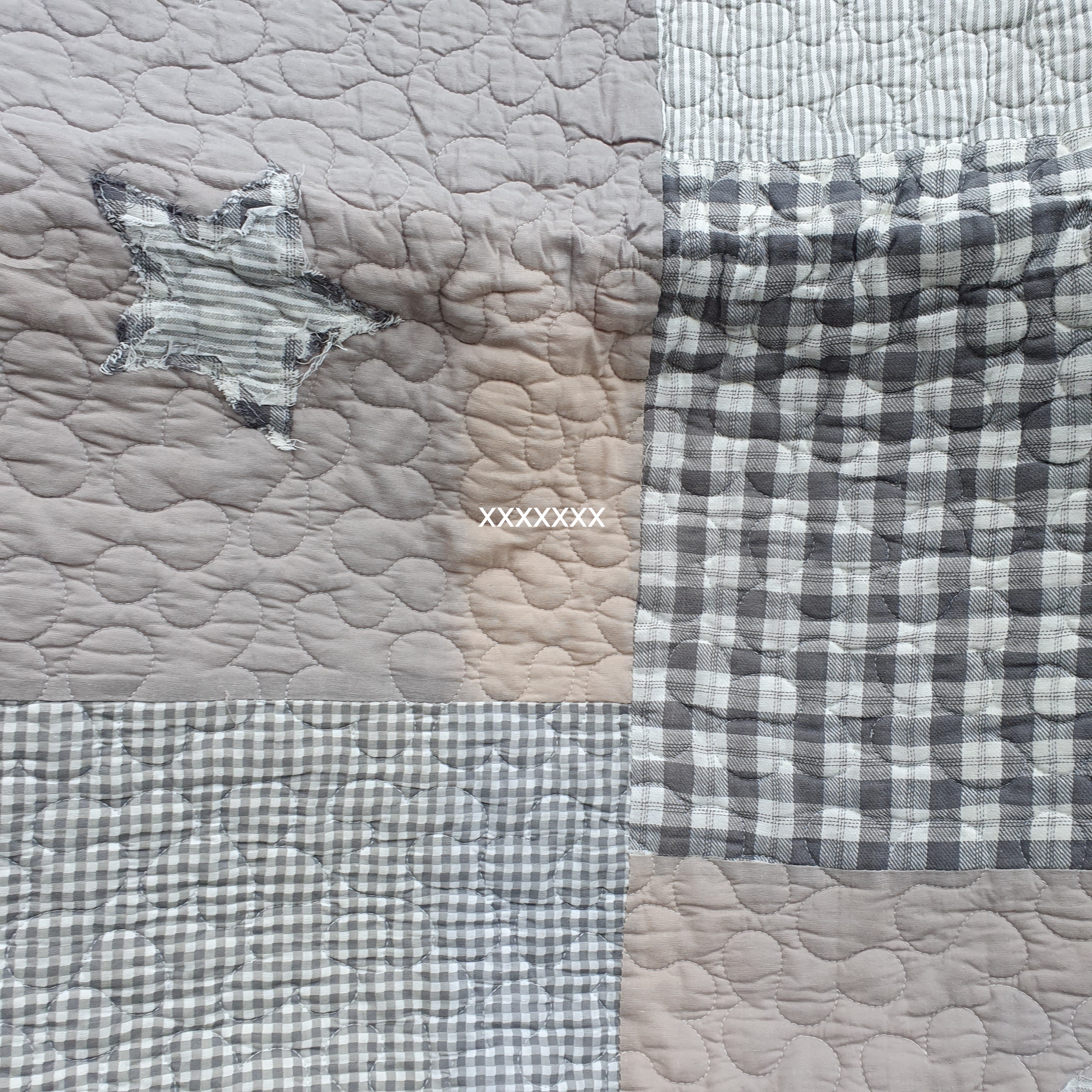 in Grau/offwhite, unterschiedliche Karos, aufgenähte Stern(e) zieren diese Decke, die Rückseite ist grau kariert, Zauberhafter-Landhausstil.