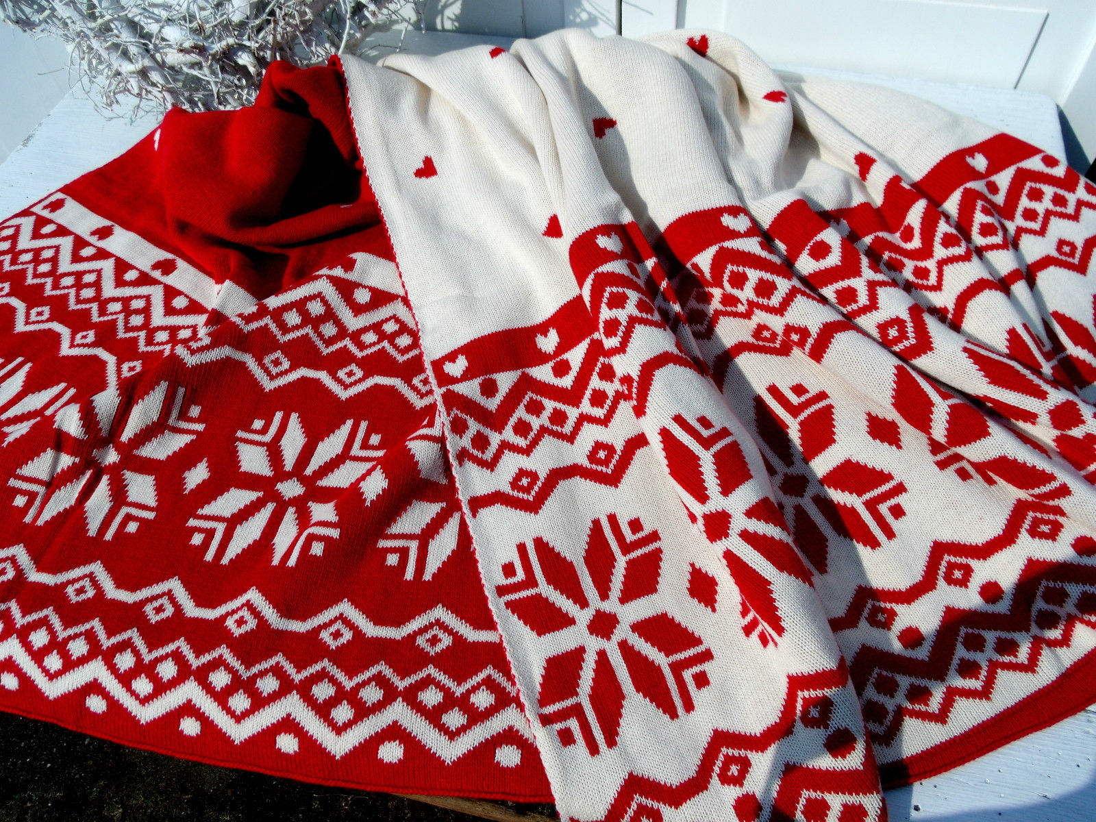 "Strickdecke Wendedecke LOVELY HEART creme/rot Sofadecke Plaid150x125 cm Sterne"