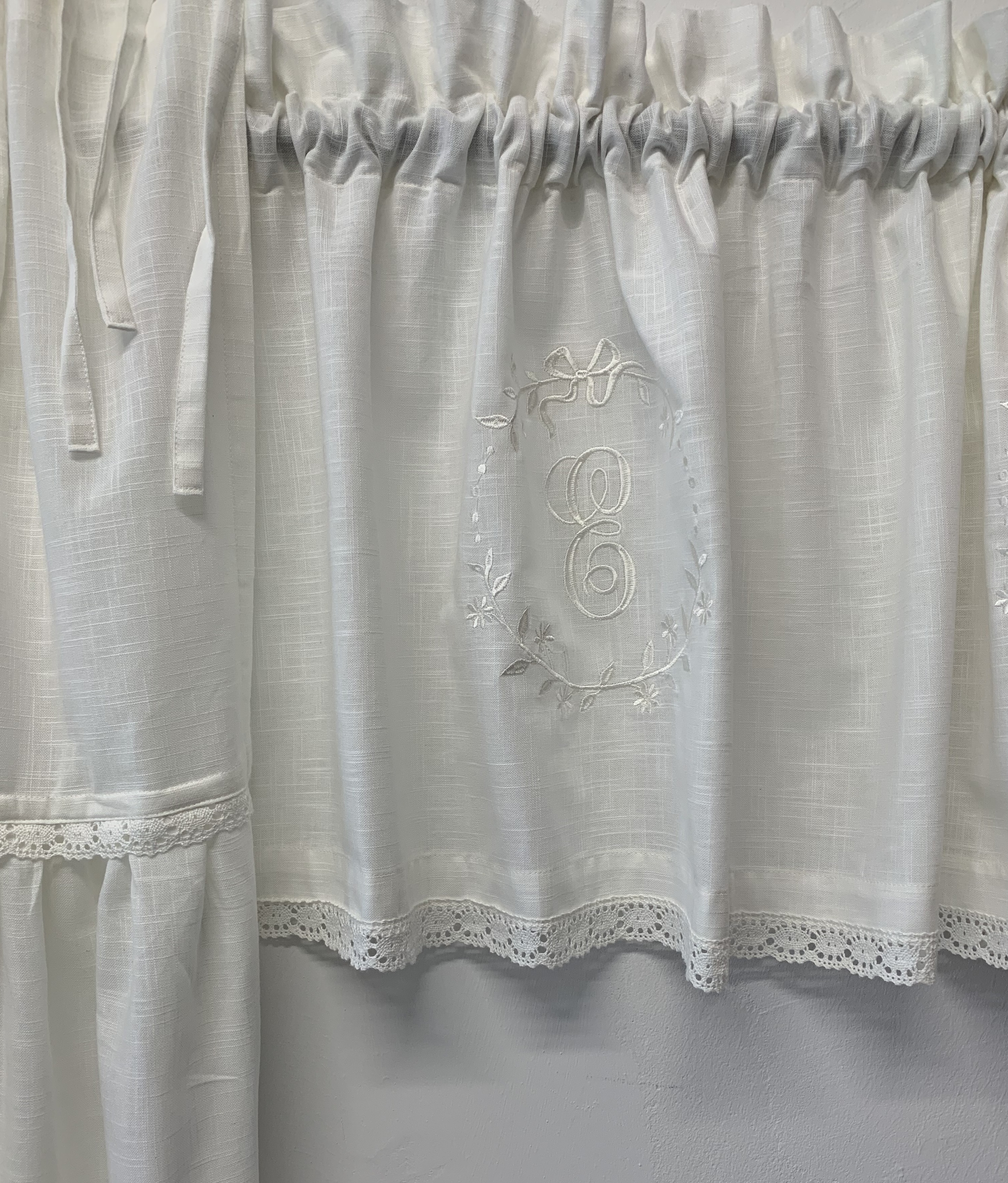 Romantisch, verspielt, bestickte Scheiben Gardine * LillaBelle Crystal * französischer Landhausstil welch zauberhafte Scheibengardine, französischer Landhausstil, perfekt zum Shabby Chic, Vintage Style. Das aufgestickte offwhite Monogramm finden Sie auf einer Breite von 250 cm 4 Mal, ein Hingucker, welch taumhafter Fensterschmuck. Die Shabby Chic Gardine wird durch einen Tunnel ( 4,5,cm breit) auf die Gardinenstange gezogen. Der Stoff hat eine leinenartige Struktur und ist fast blickdicht. Den Abschluß bildet eine Häkelspitze. Der Stoff ist handgewebt und weist an einigen Stellen kleine beigefarbene Einschlüsse auf, dies ist Bestandteil des Materials.