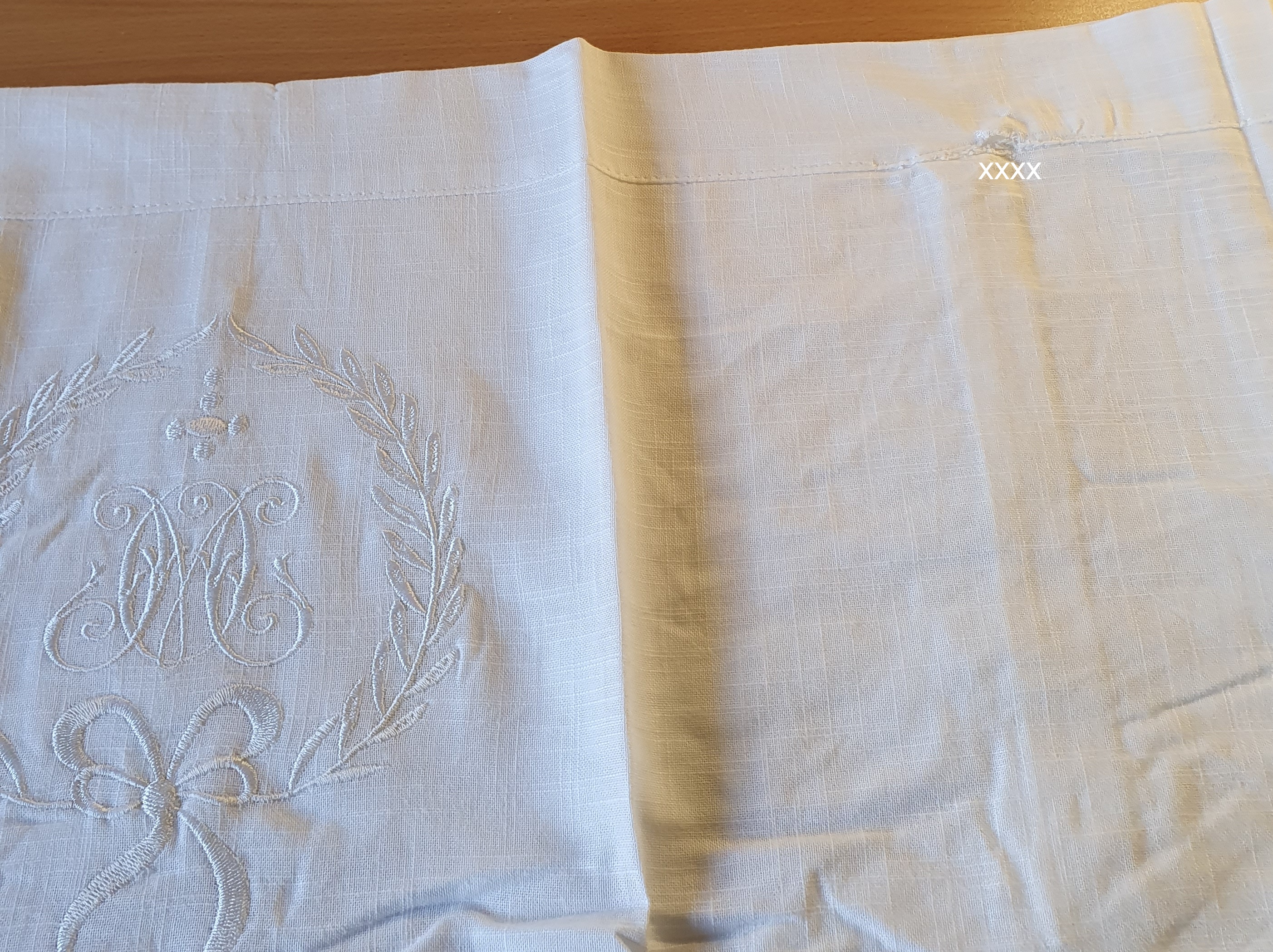 mit einem Überwurf und einem zauberhaft gesticktem Monogramm in weiß, ein Blickfang für jeden Raum. Die Gardine wird durch einen Tunnel auf die Gardinenstange gezogen. Die Höhe wird durch 4 Bänder, die unterhalb des Tunnels auf der Vorder- und Rückseite angenäht sind, fixiert. Sie haben die Möglichkeit, die Scheibengardine verspielt, in einem weich fallenden Bogen, zu drapieren, oder Sie können im unteren Tunnel einen Holzstab einziehen, dann ist der Abschluss gerade. Der Stoff hat eine leinenartige Struktur und ist fast blickdicht. Der Abschluss des Überwurfs ist mit einer Spitze versehen. Der Stoff ist handgewebt und weist an einigen Stellen kleine Fadenverdickungen auf, dieses ist Bestandteil des Materials. Das Monogramm ist auf einen ca. 31 cm langen Überwurf gestickt.