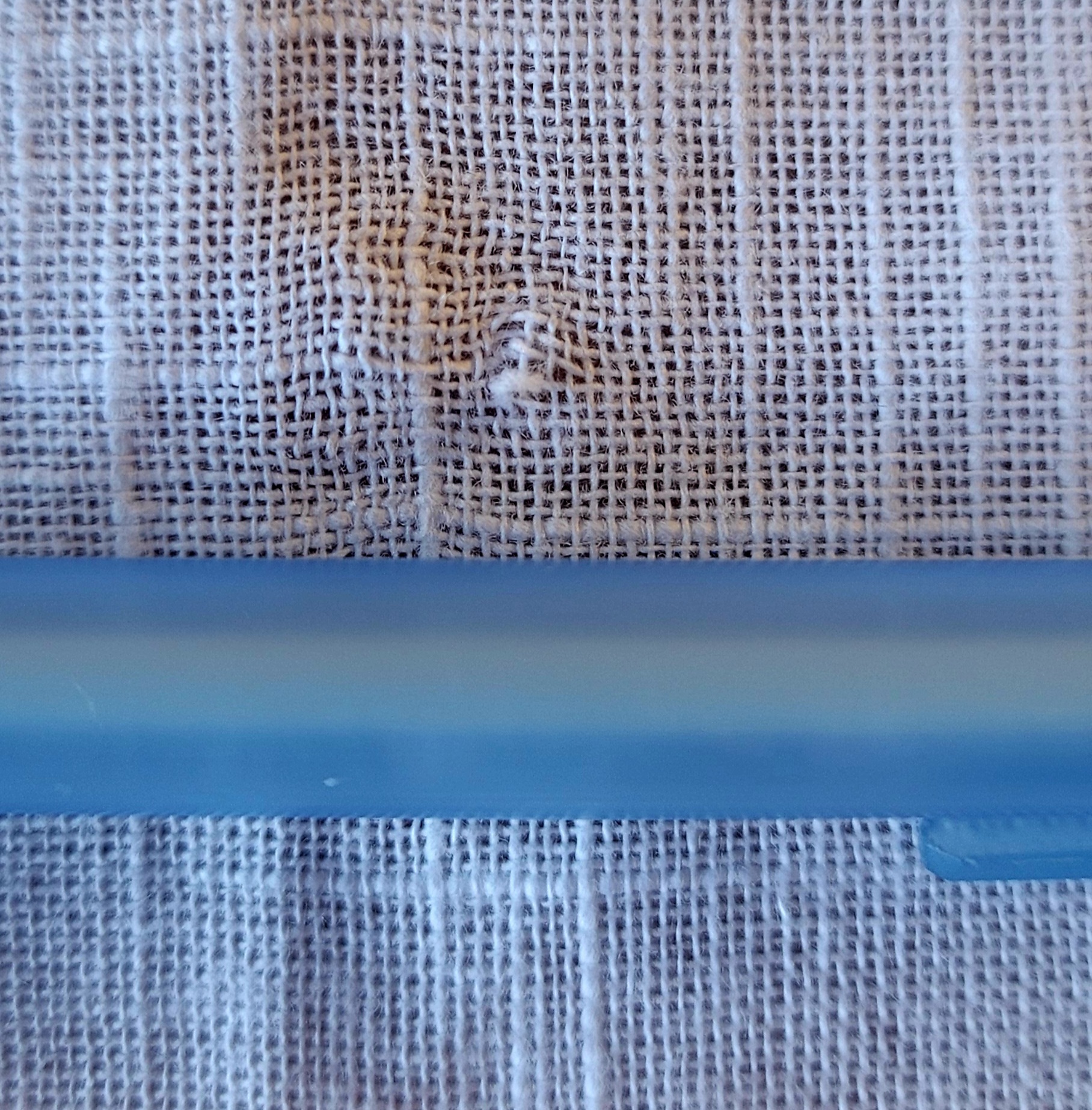 Mittig (ca 71cm von links), ca 46cm vom unteren Rand entfernt, befindet sich ein kleiner, unauffälliger Fadenriss. Kann beim raffen sehr einfach kaschiert werden. Siehe letzten beiden Bilder.