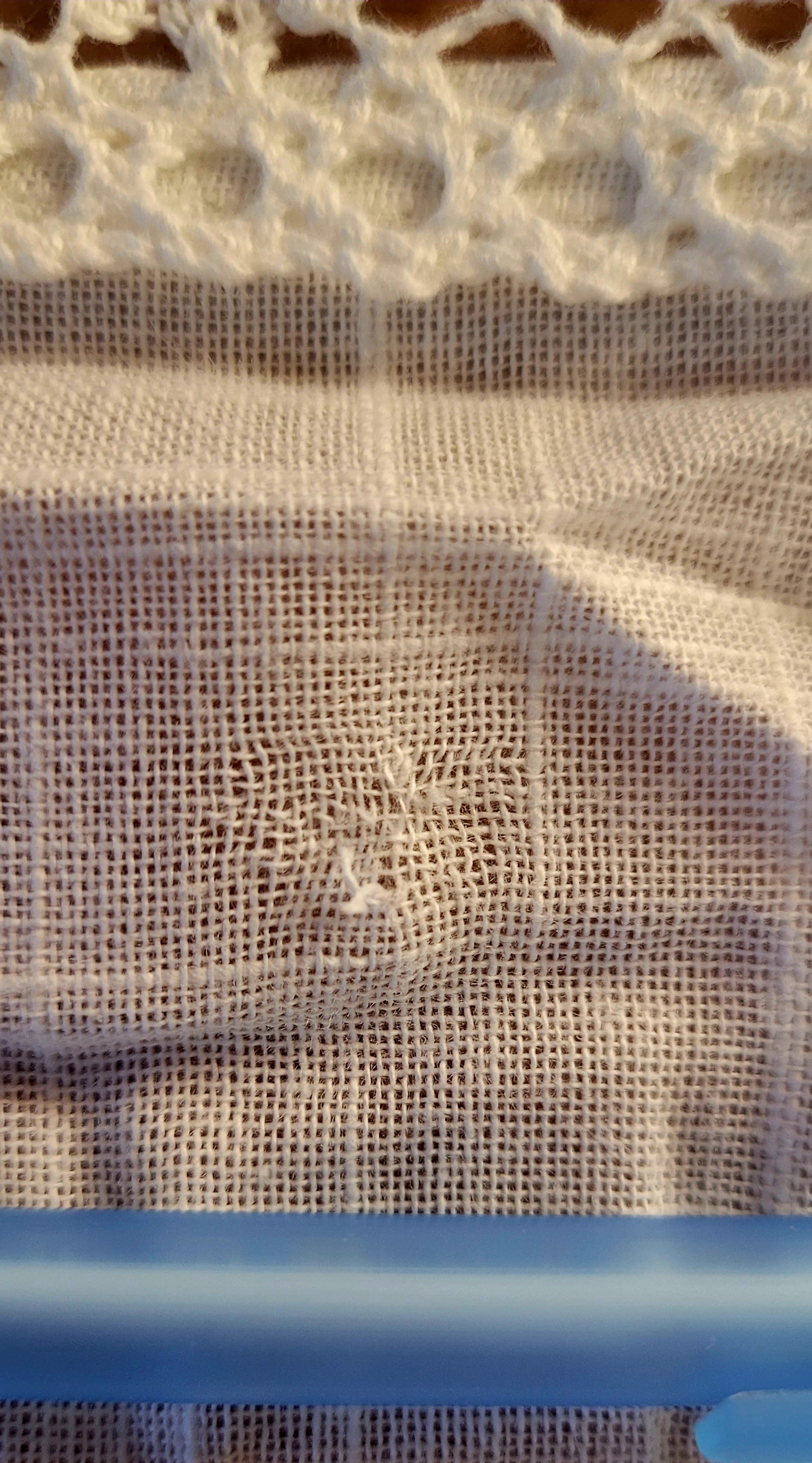 Rechts unterhalb der Stickerei befindet sich ein Fadenriss (siehe letzten beiden Bilder).