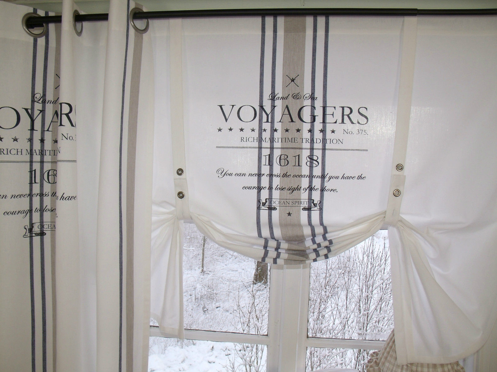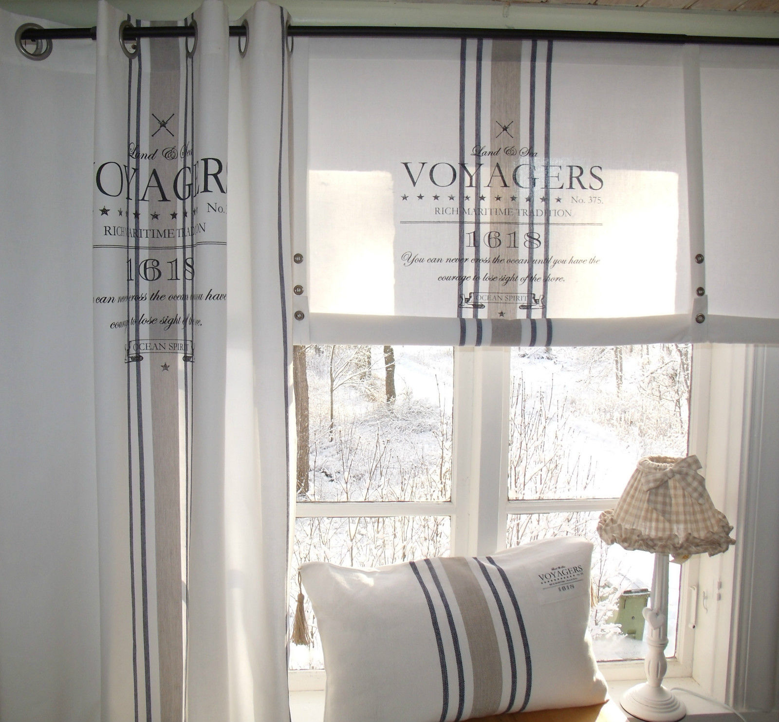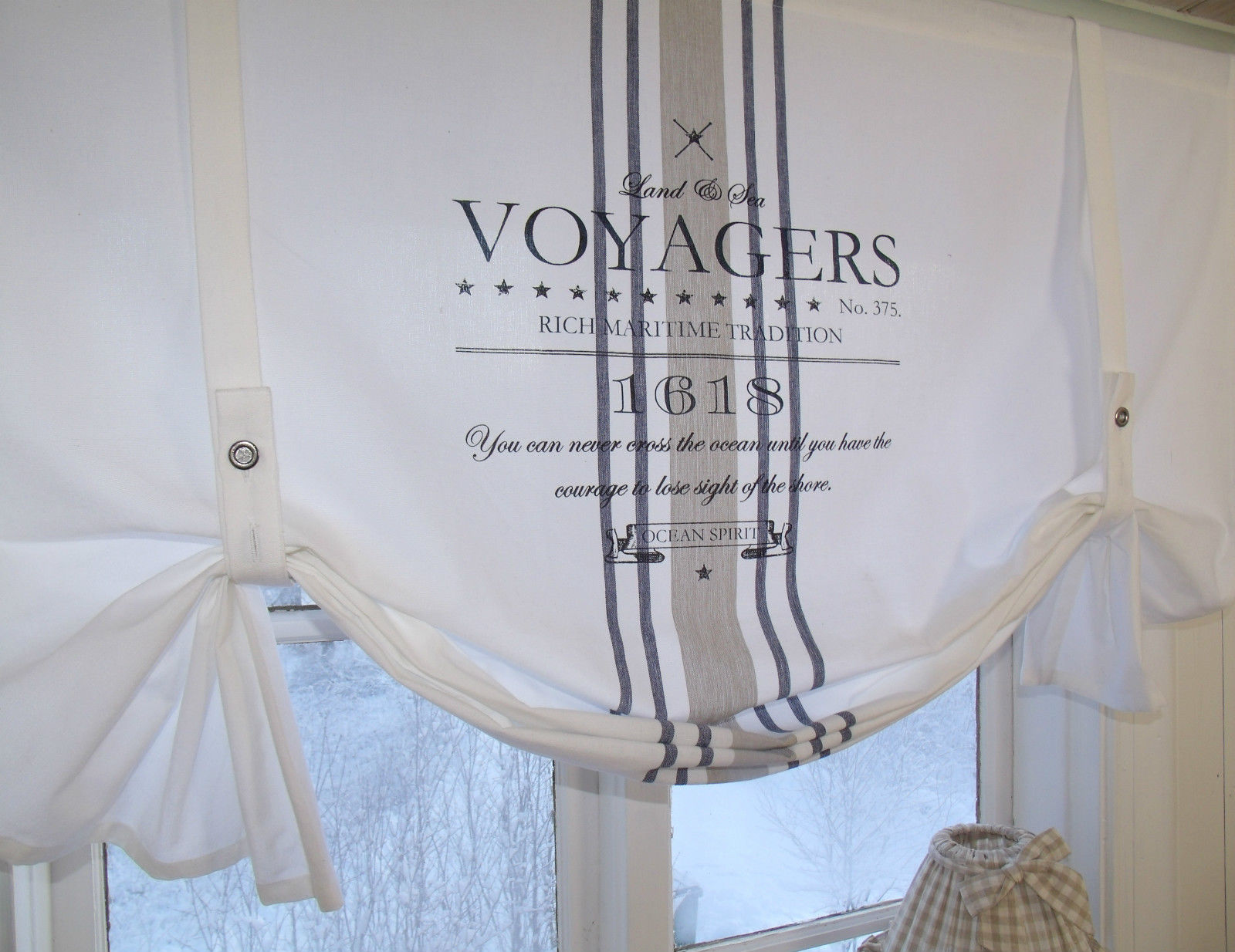 weiße ( offwhite) Baumwolle mit einem bezauberndem Druck im französischem Vintage Styl,ziert dieses traumhafte Shabby Chic Rollo . Längslaufen sand/ naturfarbene & blaue Streifen sind im Stoff eingewebt.Da der Stoff handgewebt ist, sind kleine Unebenheiten, Verdickungen Bestandteil des Stoffs und keine Fehler. Das Rollo wird durch einen Tunnel auf die Gardinenstange gezogen.Die Höhe wird durch 2 Bänder, die über die Gardinenstange gelegt werden fixiert. Die Knöpfe als Verschluß ermöglichen die Regulation der Höhe, ca. 48 cm, 51 cm oder 54 cm.Unten kann ein Holz- oder Metallstab ( nicht im Lieferprogram enthalten) in den Tunnel zur Beschwerung eingeschoben werden, dann ist der Abschluß gerade ( wie auf dem letzten Foto).
