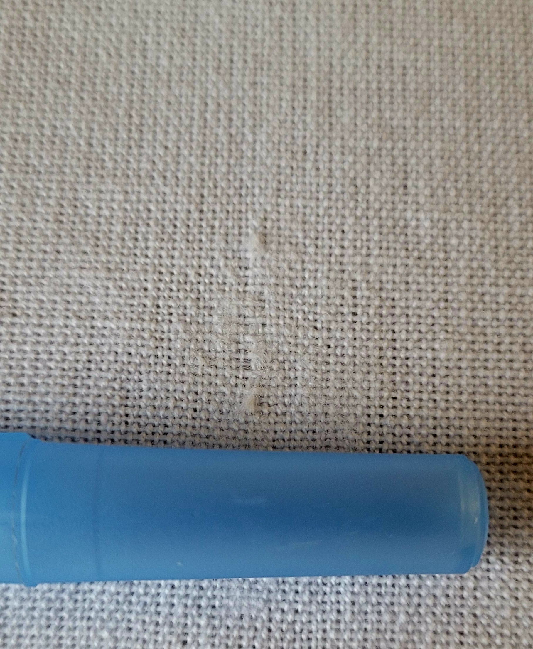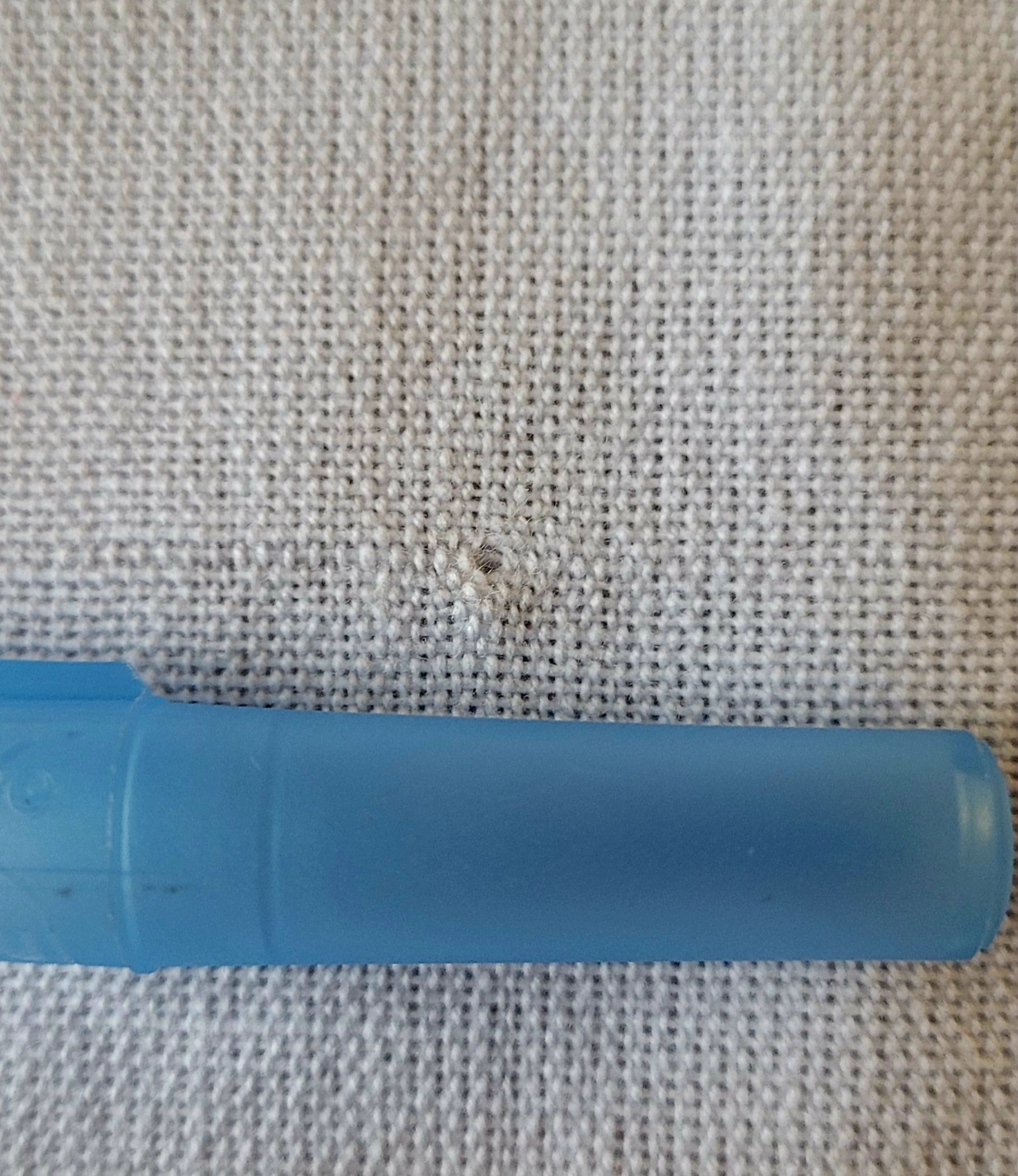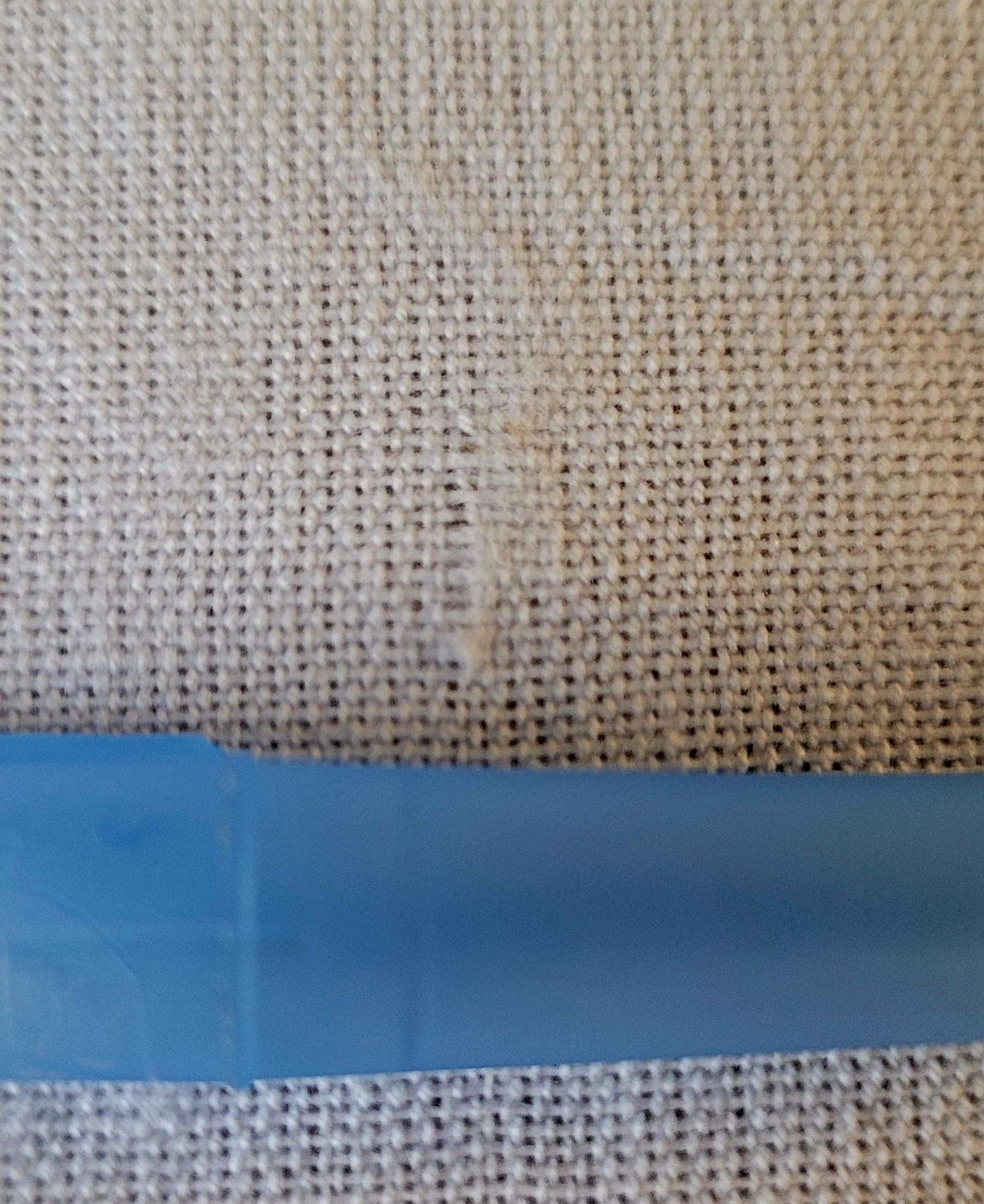 Links der Gardine befinden sich drei fehlerhafte Stellen. Einmal ein kleines Löchlein und zwei kleinere Fadenrisse (siehe letzten Bilder). Nichts davon ist wirklich auffällig.