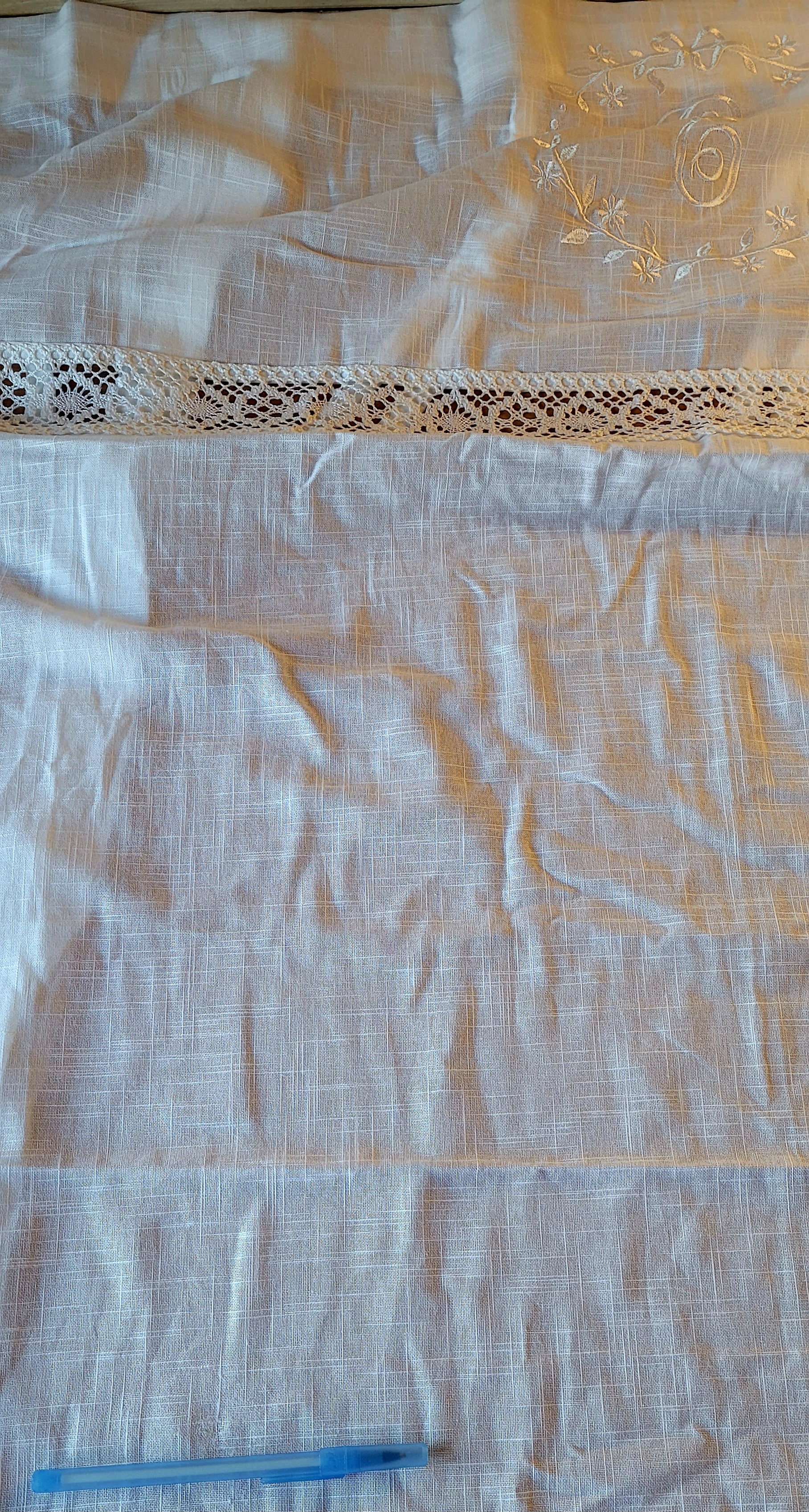 welch zauberhafte Raffgardine, französischer Landhausstil, perfekt zum Shabby Chic, Vintage Style mit einem zauberhaft aufgesticktem Monogramm ( nicht wählbar) und Kranz sowie einer Häkelspitze. Das Shabby Chic Rollo wird mit Schleifenbändern an der Gardinenstange fixiert. Die Höhe wird durch 4 Bänder, die auf der Vorder- und Rückseite angenäht sind, fixiert. Sie haben die Möglichkeit die Gardine verspielt zu drapieren oder können im unteren Tunnel einen Holzstab (nicht im Lieferumfang enthalten) einziehen, dann ist der Abschluß gerade. Der Stoff hat eine leinenartige Struktur ist handgewebt und weist an einigen Stellen kleine beigefarbene Einschlüsse auf, dies ist Bestandteil des Materials.