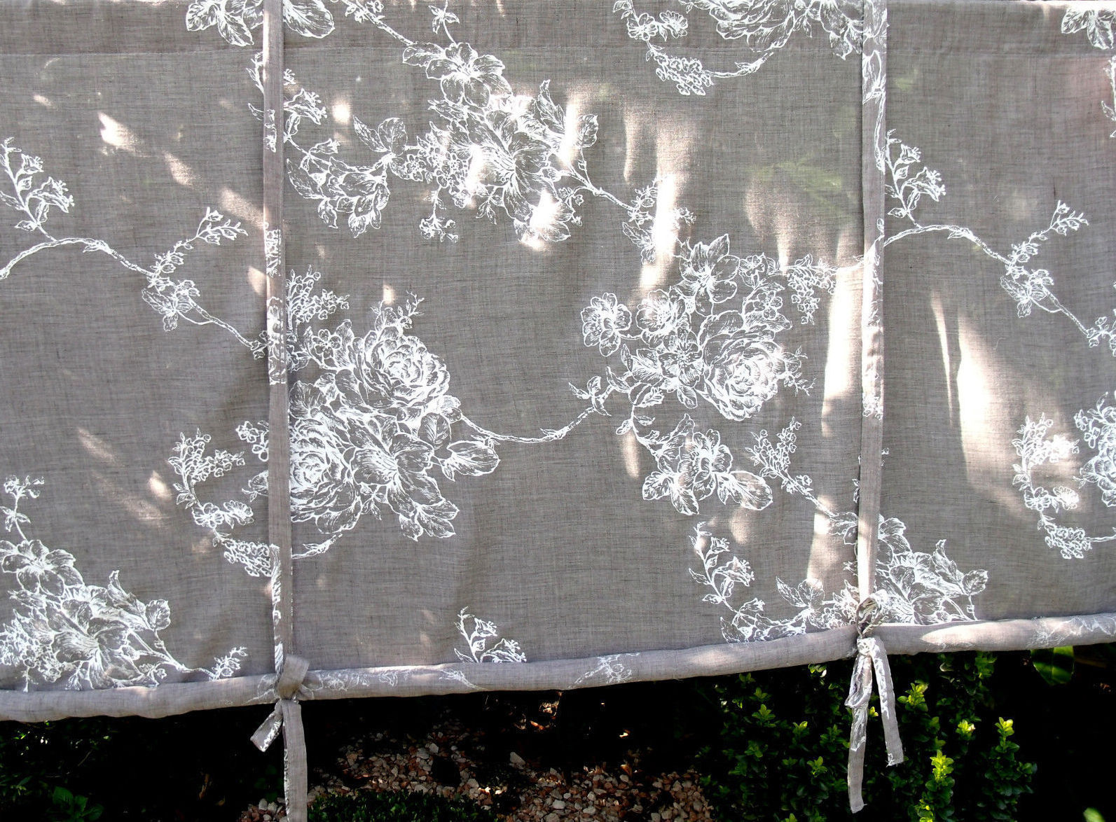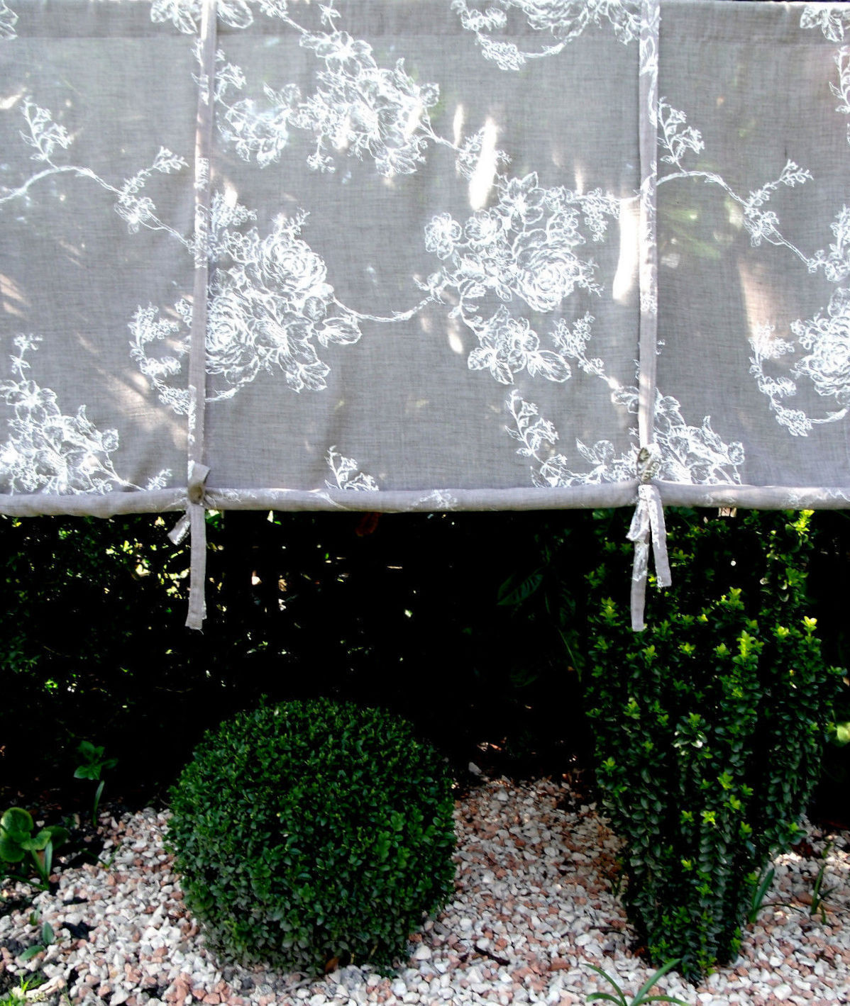 bezauberndes Raff Rollo im filigranen Landhausstil, braun creme . Welch extravagantes Design........Je nach Lichteinfall und Sonneneinstrahlung verändert sich derFarbton braun/grau (taupe), die Blumenornamente stellen sich ebenfalls mehr oder weniger intensiv dar. Das Rollo wird durch einen Tunnel auf die Gardinenstange gezogen und mit Hilfe 2 er Bänder,die über die Gardinenstange gelegt werden in der Höhe fixiert.Damit die Gardine perfekt fällt, legen Sie in den unteren Tunnel einen Holzstab( nicht im Lieferumfang enthalten), dann ist der Abschluß gerade.