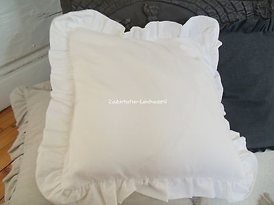 Kissenbezug im französischem Vintage Styl, ziert diese Shabby Chic Kissenhülle. Da der Stoff handgewebt ist, sind kleine Unebenheiten, Verdickungen Bestandteil des Stoffs und keine Fehler. Ein umlaufender Volant verleiht dem Bezug ein romantisches Aussehen. Die Rückseite ist ebenfalls einfarbig. Durch einen Reißverschluß lässt sich der Bezug auf der Rückseite schließen.