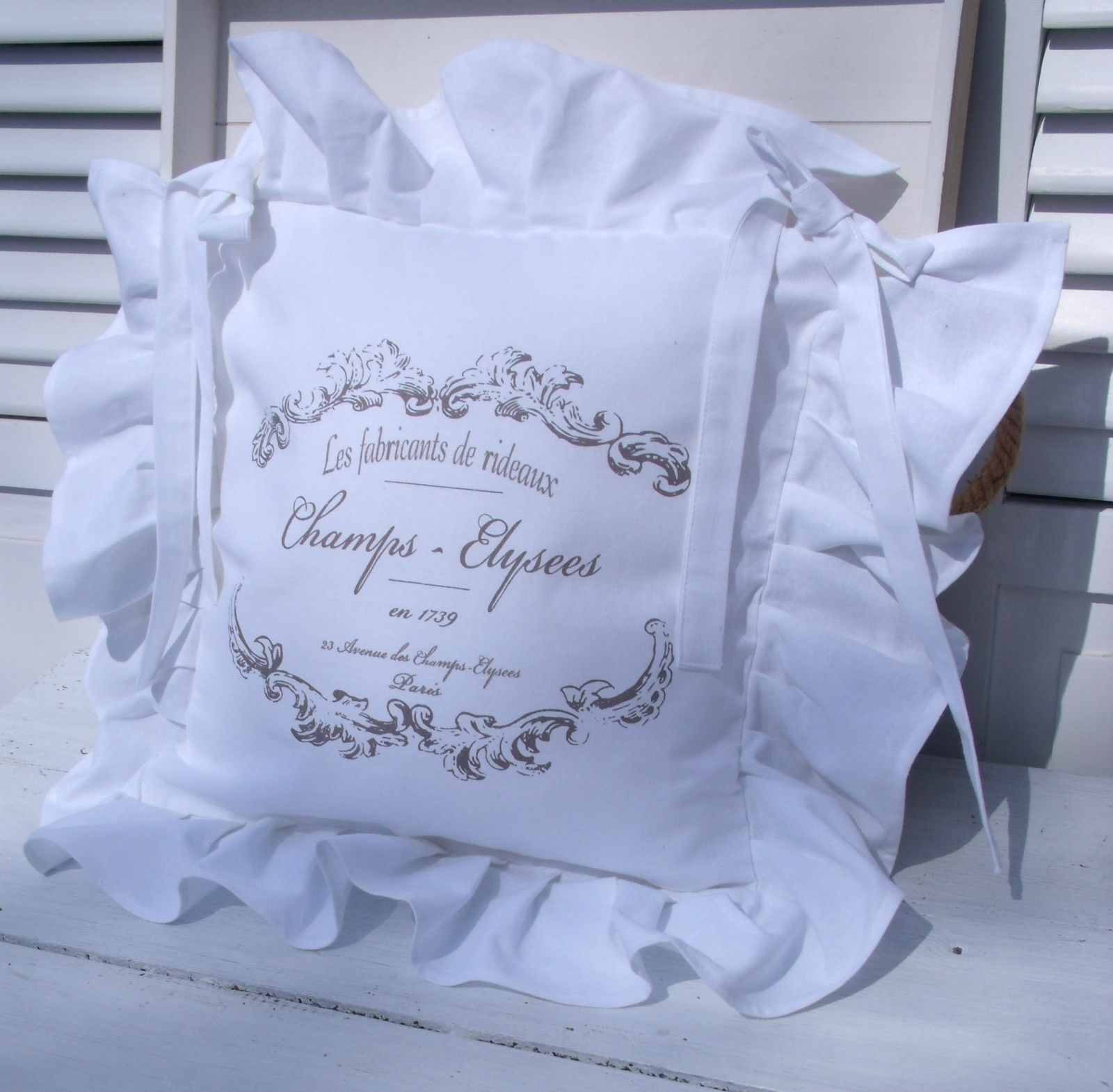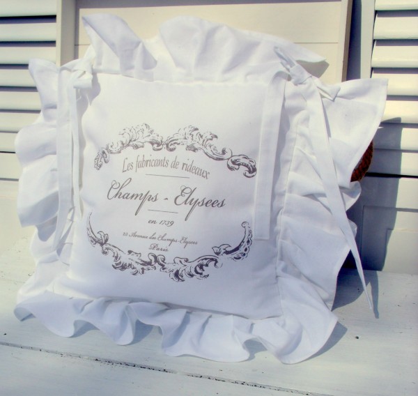 Verspielte Stuhlkissenhülle * LillaBelle Elegance * weiß, französischer Landhausstil, Shabby Chic - Vintage Style ein neues Kleid für Ihre Eßzimmerstühle, sie werden die Blicke auf sich ziehen.....Die entzückende Stuhlkissenhülle der beliebten Serie LillaBelle Elegance ziert ein bezaubernder Aufdruck in braun/schwarz. Der Stoff ist handgewebt, leichte Verdickungen sind ein Zeichen der Handarbeitund kein Fehler.Der extra lange Volant mißt ca. 12 cm, befindet sich an 4 Seiten.Fixiert wird der Stuhlkissenbezug mit 2 x 2 Schleifenbändern am Stuhlbein, auf der Rückseite befindet sich der Reißverschluß. Ein kleines Kunstwerk ganz im Shabby Chic, Vintage Stil.