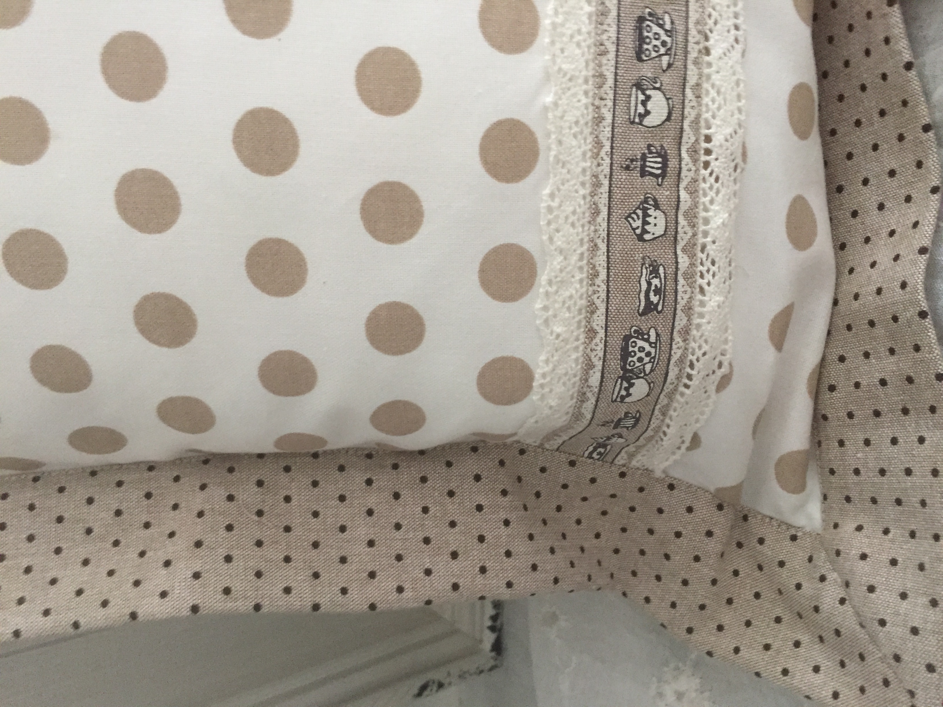 Kissenbezug *Coffee* Natur 40 x 40 cm Kissenbezug *Coffee*zauberhafter Kissenbezug im Landhausstil.naturfarbene Punkte auf Cremefarbenem Grund, eine Bordüre mit aufgedruckten Kaffeekannen, eingefasst mit einer Spitze, beidseitig . Ein umlaufender Steeg als Abschluß, nougatfarben gepunktet ziert den Bezug.Extravaganz pur...... Die Rückseite Kaffeekannen auf naturfarbenem Grund, mit einem Reißverschluß versehen.Zauberhafter Landhausstil.........