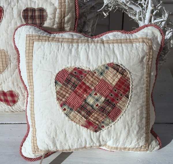 Kissenbezug Herzchen in creme mit zauberhaften Patchworkherz in den unterschiedlichsten karierten Farbkombinationen, rot/creme, helbraun/creme....... Romantik pur.....Die Umrandung ist creme/hellbraunkariert, die Rückseite rot/creme kariert, ebenso die Einfassung mit einem gewellten Rand.