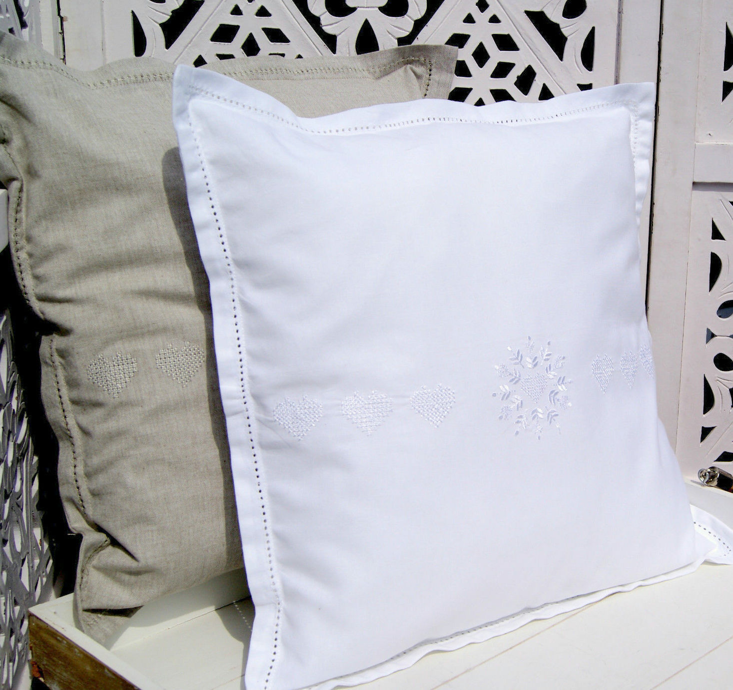 Shabby Chic Mandy Kissenbezug weiß/weiß bestickt zauberhafter Shabby Chic Kissenbezug *LillaBelle Mandy* in weiß bestickt..... mit einem Stegsaum, den Übergang ziert ein bezaubernder Hohlsaum und aufgestickte Herzen .....Auf der Rückseite befindet sich der Reißverschluß. Ein kleines Kunstwerk ganz im Shabby Chic, Vintage Stil