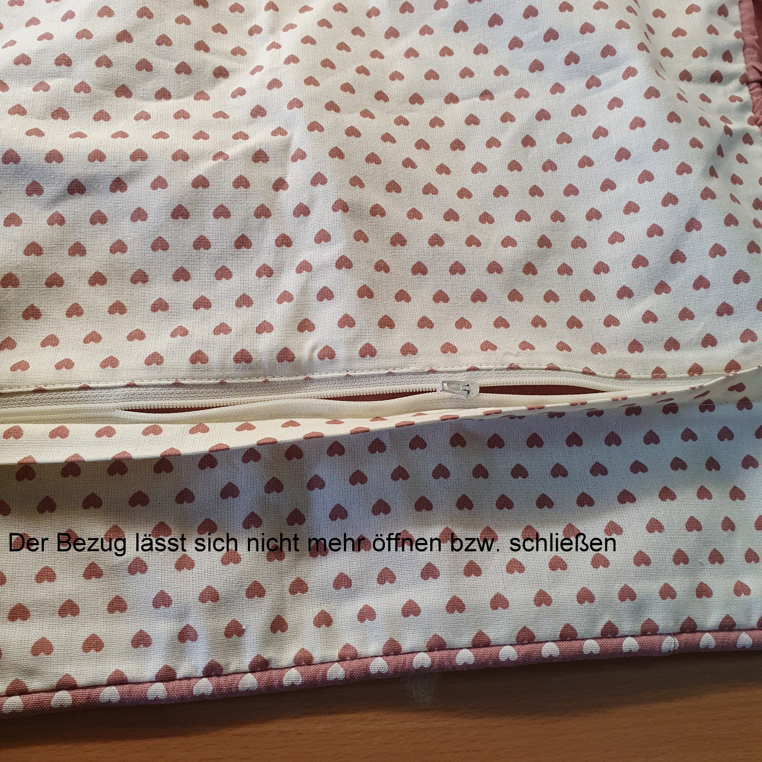 Bei einem der Stuhlkissenbezüge fehlt der Zipper incl. Schlitten. Bei dem zweiten Bezug lässt sich der Reißverschluss nicht mehr richtig schliessen