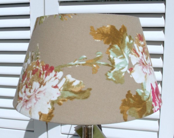 Traumhafter Lampenschirm *Eileen* im klassischem Stil, Dieser hochwertige, elegante Lampenschirm unterstreicht das edle Design. Ein bezaubernder Stofflampenschirm in der Farbgebung taupe mit einem imposanten Blumenaufdruck in der Farbgebund grün, braun/taupe, weiß und rose.