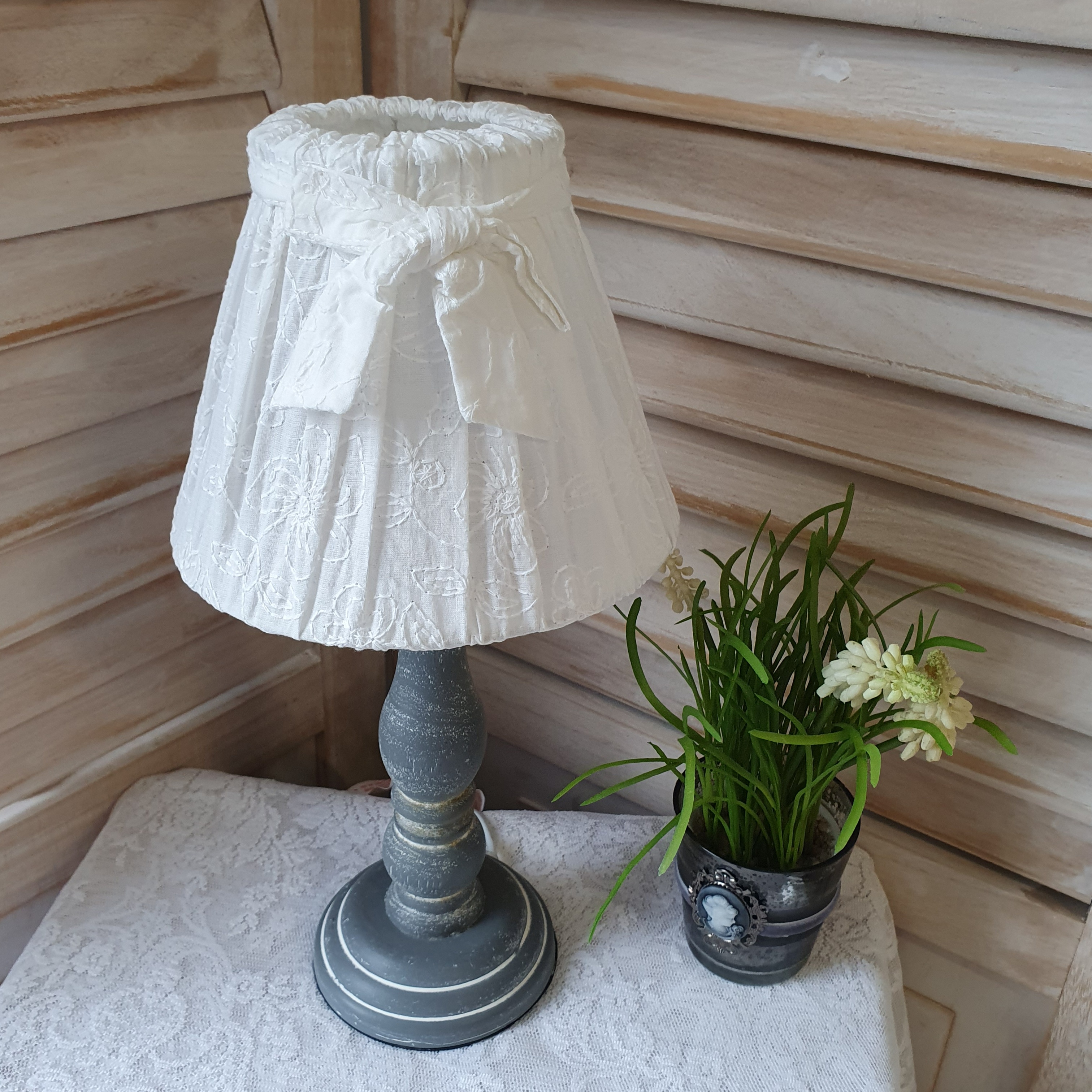 "Tischlampe AMBER Offwhite Grau E27 Holz Stoff Landhaus bestickt"