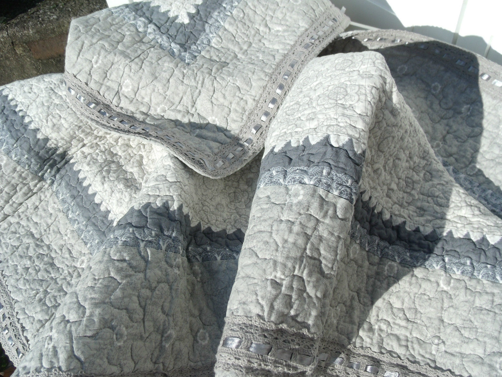 Hochwertige, romantische Tagesdecke in unterschiedlichen Grautönen. Das Mittelfeld ist in hellem creme mit hellgrauen Blumenornamenten gehalten, ebenso die Rückseite. Den Abschluß der Decke bildet eine romantische Häkelbordüre ind dunkelgrau. Als besonderes Highlight, ein Satinband, welches durch die Bordüre gezogen ist.......Romantik Pur.Ein Highlight für Ihren Lieblingssessel, Sofa.zaubert den Landhausstil in Ihre Räume......