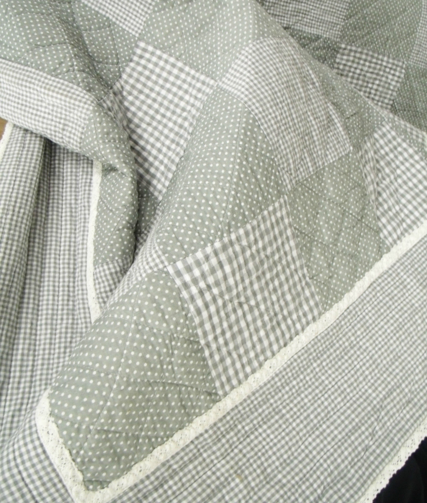 in grau/weiß kariert& gepunktet.Perfekt zum Landhausstil, immer wieder ein Hingucker diese zauberhafte Komposition aus grau/weißen Karofeldern im Kontrast zu weißen Punkten auf grauem Grund. Ganz bezaubernd die umlaufende Häkelbordüre. Die Rückseite ist gepunktet. Romantik Pur.....