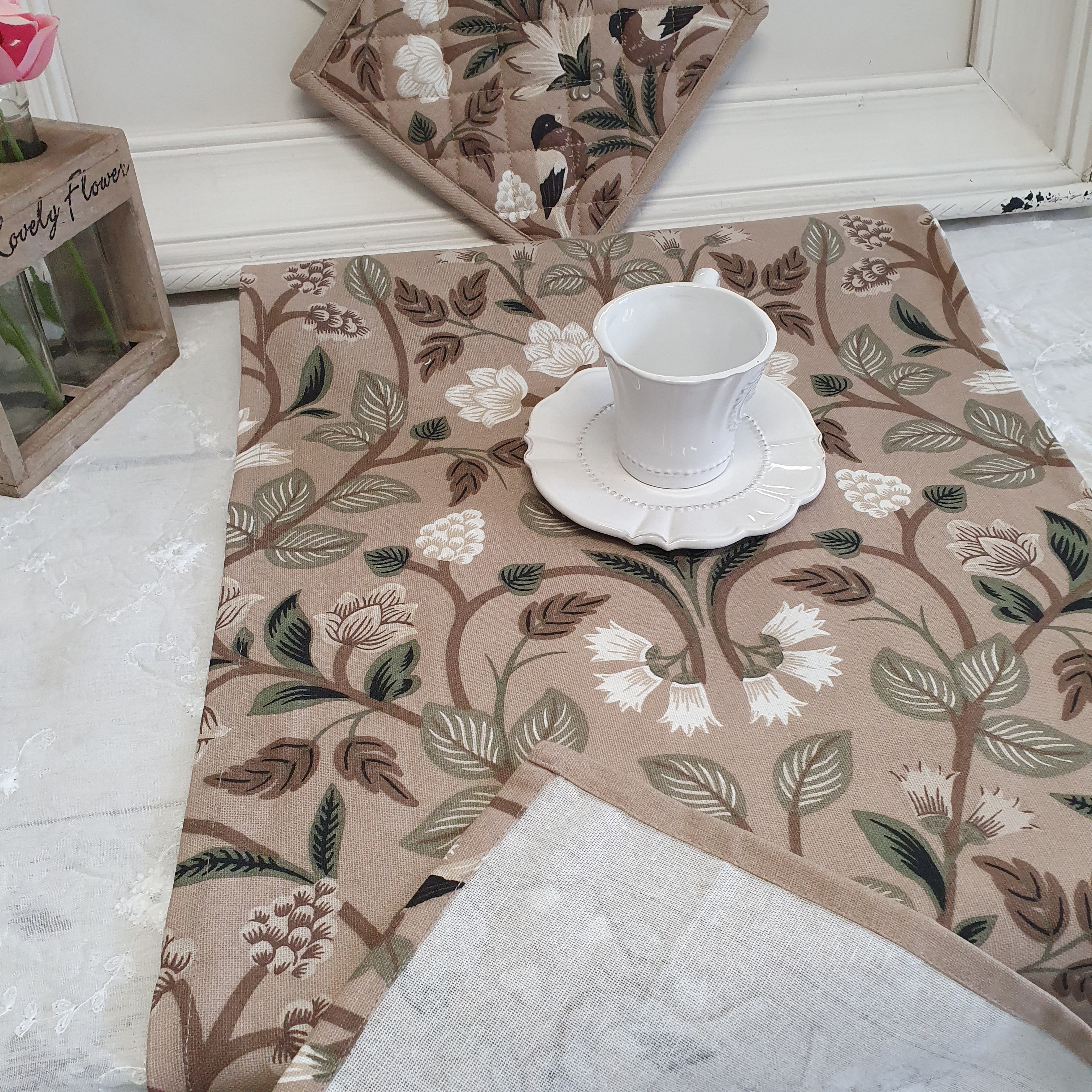 Tischläufer LIDO Blumen Sand Braun offwhite 40 x 140 cm Baumwolle Landhaus